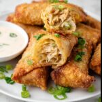 A sprinkle of finely chopped green onions or fresh parsley adds a lovely pop of color and a hint of freshness on top of your crispy egg rolls. A drizzle of ranch or blue cheese dressing pairs perfectly and cools down the spicy buffalo kick.
