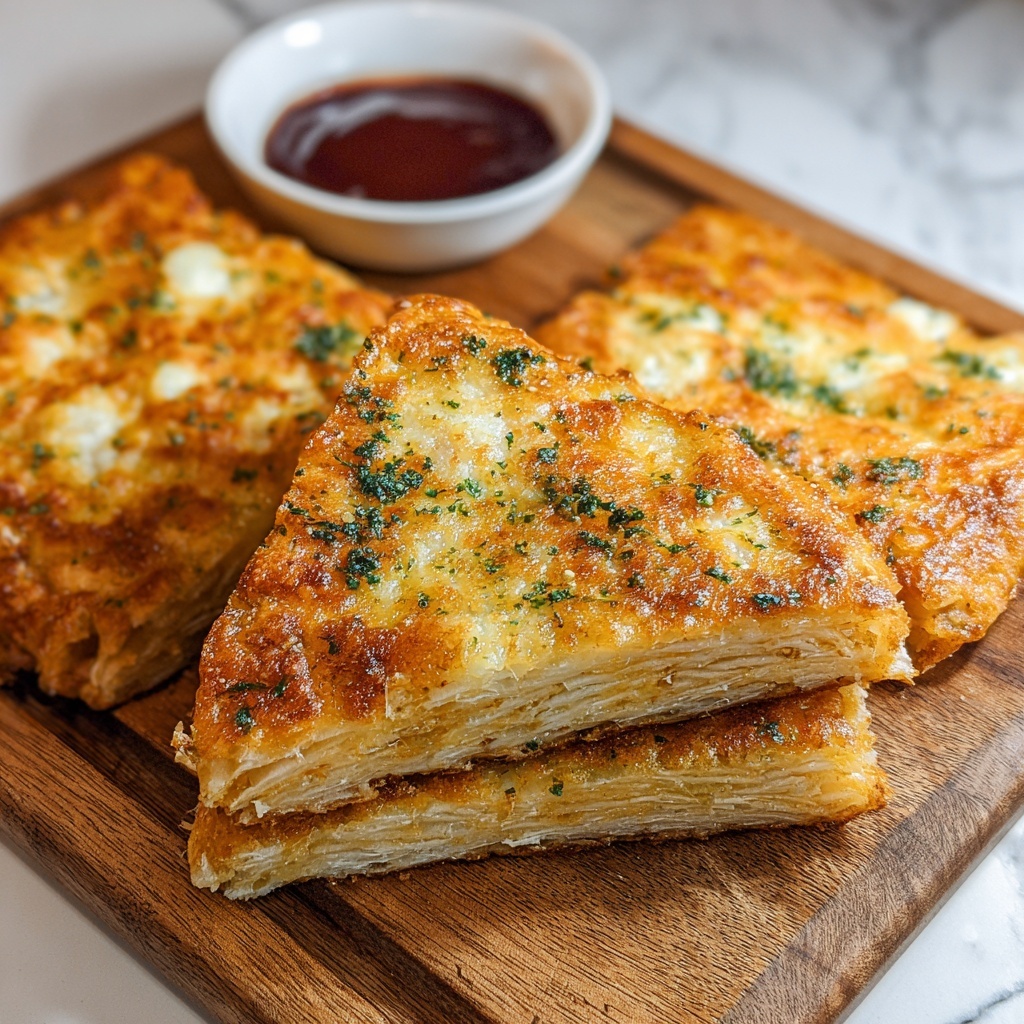 Once cooked, remove the tortillas and scatter fresh parsley or your favorite herbs on top. Slice them into wedges and serve immediately to enjoy the heavenly combo of gooey cheese and crispy garlic bread texture.