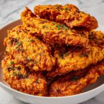 Once your chicken tenders are cooked and beautifully crisp, transfer them to a large bowl. Pour the warm honey butter garlic sauce over the tenders and toss gently to make sure every piece is coated with that glossy, flavorful glaze. The sauce will cling to each tender, delivering an explosion of flavor in every bite.