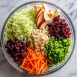 Start by shredding the green and red cabbage finely. Julienne or thinly slice the apple and immediately drizzle it with lemon juice to keep it from browning. Grate the carrot, slice the onions thinly, and chop the parsley if you are using it. Combine all the veggies and fruit gently in a large bowl so that every strand gets a moment in the spotlight.
