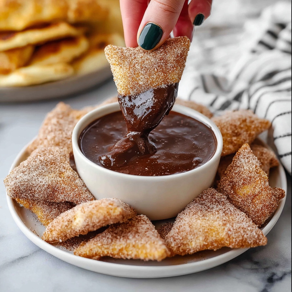 Delight in these crispy, golden baked churro chips made from naan or pita bread, coated in cinnamon sugar and served with a luscious chocolate ganache for dipping. This easy-to-make recipe transforms simple ingredients into a fun and addictive snack perfect for sharing or enjoying solo.