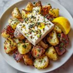 This Baked Feta Potatoes recipe features tender, golden roasted potatoes seasoned with Mediterranean herbs and spices, topped with creamy baked feta cheese, fragrant garlic, fresh basil, and a drizzle of honey. It’s a comforting and flavorful dish perfect as a side or a vegetarian main, combining rustic textures with bright, savory, and slightly sweet notes.