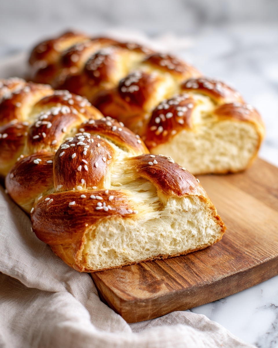 Challah bread is a traditional Jewish braided loaf known for its soft, fluffy texture and subtly sweet flavor. With its golden crust and tender crumb, it’s perfect for holiday celebrations, sandwiches, or simply served warm with butter.