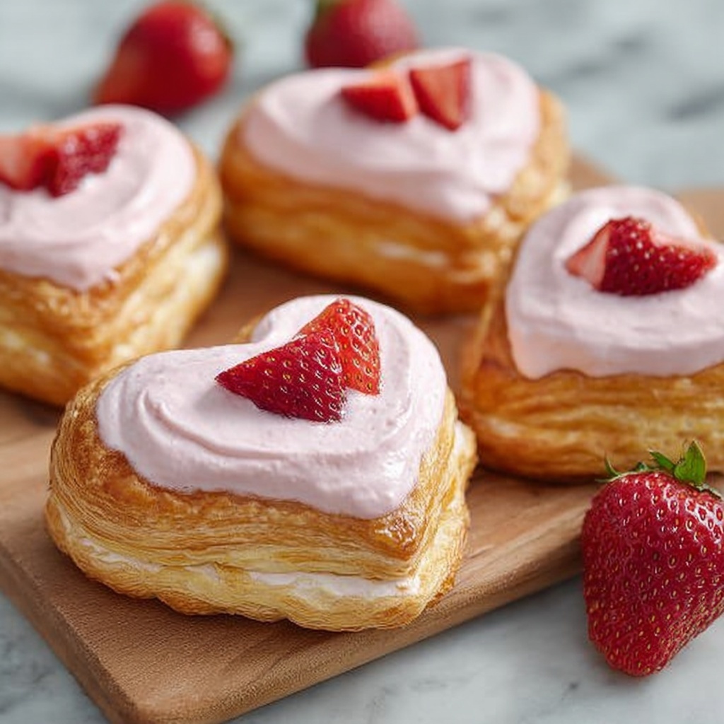 Delight in these charming Cheese and Strawberry Heart Pastries, featuring flaky puff pastry hearts filled with a smooth cream cheese and strawberry jam blend, topped with fresh diced strawberries. Perfectly golden and dusted with powdered sugar, they make a lovely treat for any occasion.