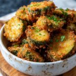 To reheat leftover fried pickles, skip the microwave to avoid sogginess. Instead, pop them in a preheated oven or air fryer at 375°F for 5-7 minutes until heated through and crisp again. They’ll taste almost as good as fresh!