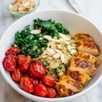 - Assemble Bowls: Divide the quinoa evenly among four bowls. Top each with sliced chicken, sautéed kale, charred tomatoes, and toasted slivered almonds. Garnish with chopped parsley and serve immediately.