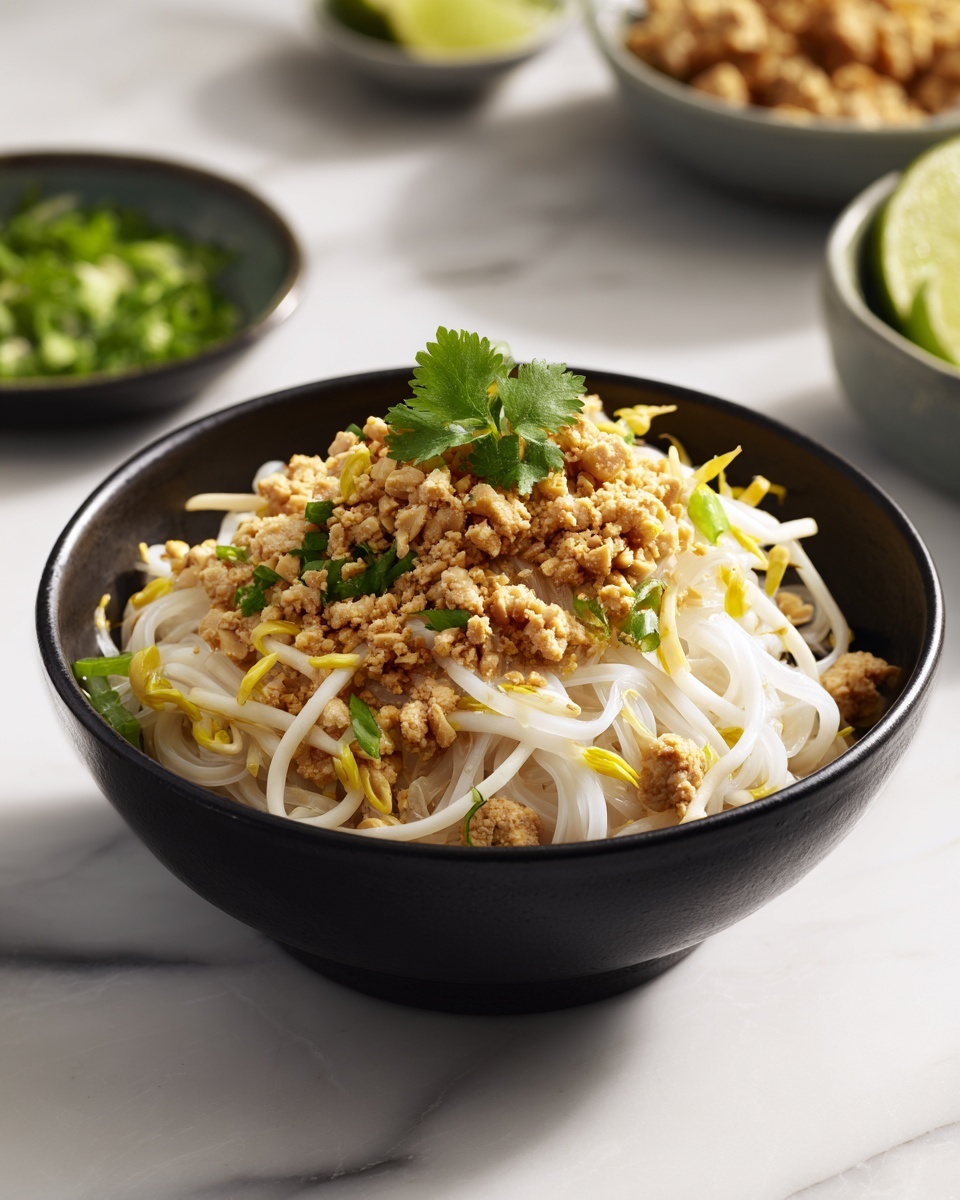 Remove the skillet from heat, then sprinkle generously with crushed roasted peanuts and fresh cilantro. Don’t forget the lime wedges to squeeze over for that final citrus burst. Serve immediately for the best experience of your Chicken Pad Thai Recipe.