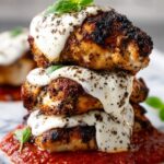 Spoon a tablespoon of rich marinara sauce over the mozzarella on each chicken breast, then sprinkle with grated Parmesan cheese. This combination not only adds a tangy, savory depth but also ensures a bubbly, golden finish once baked.