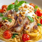 This Chicken Spaghetti with Burrata and Lemon Butter Garlic Sauce is a flavorful and elegant pasta dish that combines tender, seasoned chicken breasts with roasted cherry tomatoes, a zesty lemon butter garlic sauce, creamy burrata cheese, fresh basil, and toasted pine nuts. Perfect for a comforting yet sophisticated dinner in just 50 minutes.