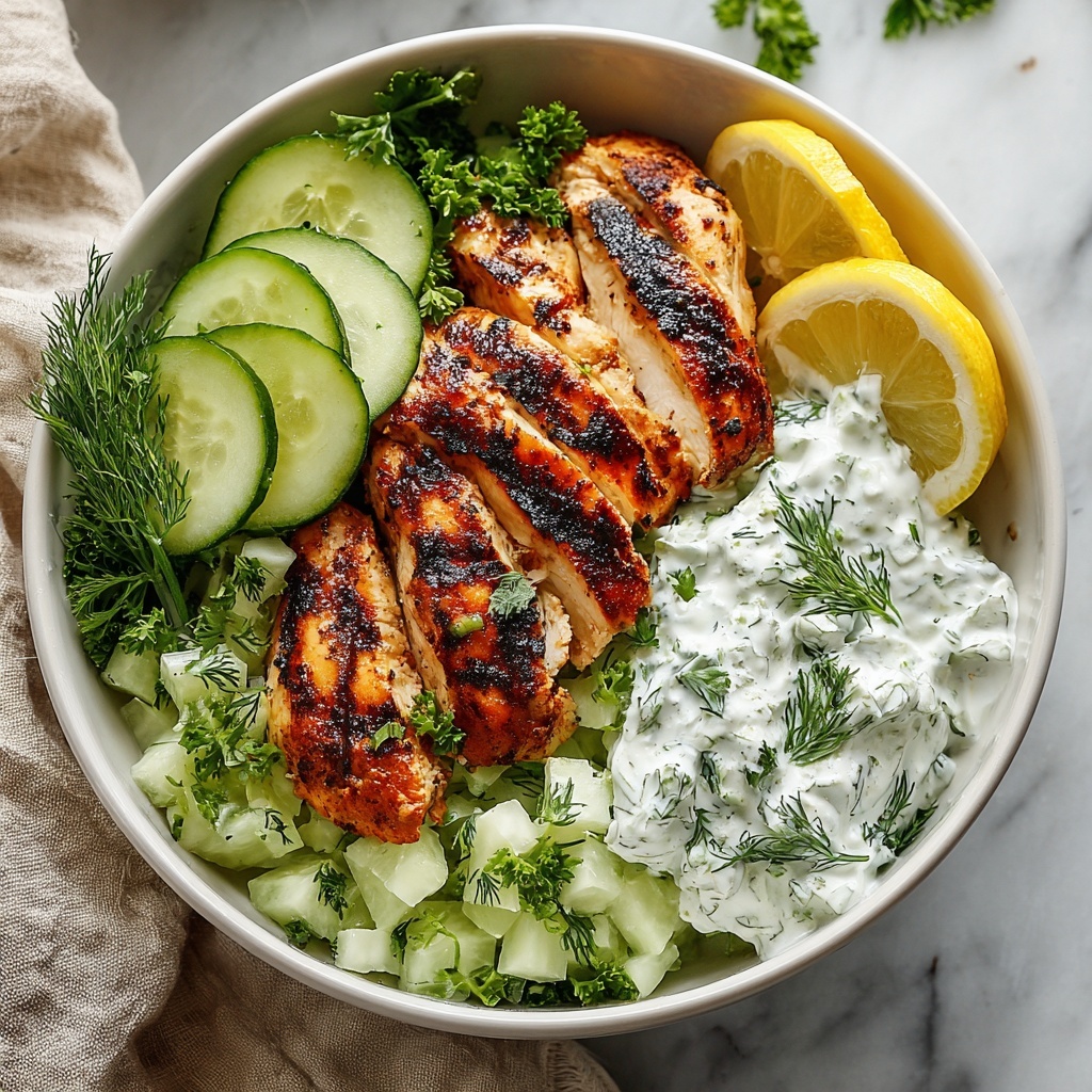 For a fresh burst of color and flavor, sprinkle chopped fresh parsley or dill over your Chicken Tzatziki Bowls. A few lemon wedges on the side can brighten each bite with a zesty splash. Toasted pine nuts or a sprinkle of sumac also add a lovely crunch and an authentic Mediterranean touch.
