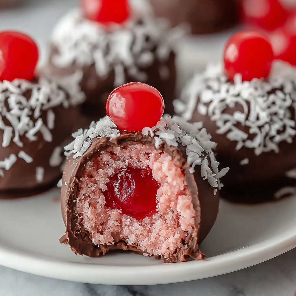 Delight in these luscious Chocolate Maraschino Cherry Coconut Truffles, combining the tropical sweetness of shredded coconut with smooth chocolate and a surprise cherry center. Perfect as a festive treat or elegant dessert, these no-bake truffles offer a creamy, rich flavor with a subtle almond and vanilla undertone.