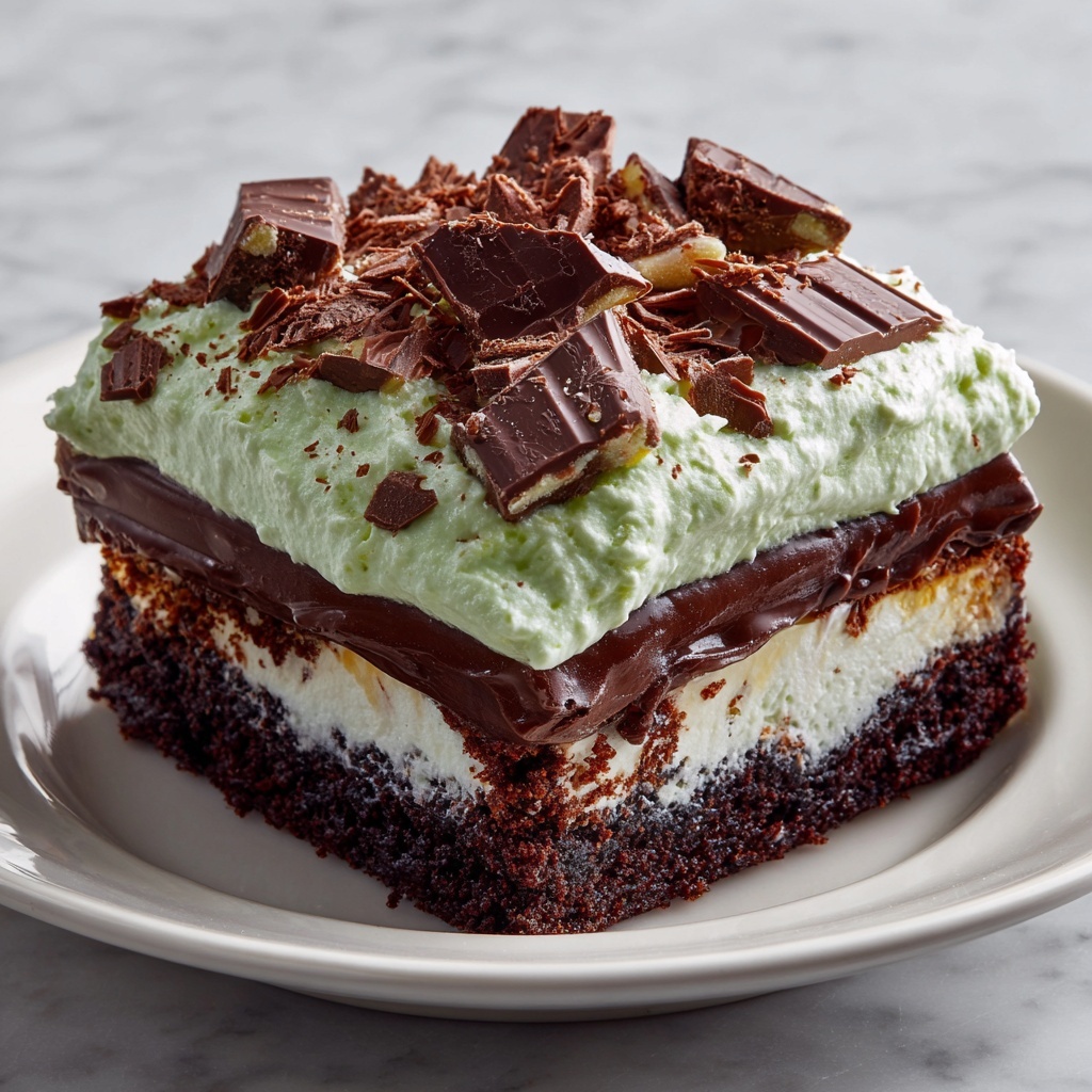 Serve this Chocolate Mint Poke Cake Recipe in elegant individual glass cups to showcase the layers or cut into fun shapes using cookie cutters for themed parties. You could also drizzle warm chocolate sauce over each slice or add edible glitter for special occasions to really make your dessert table stand out.