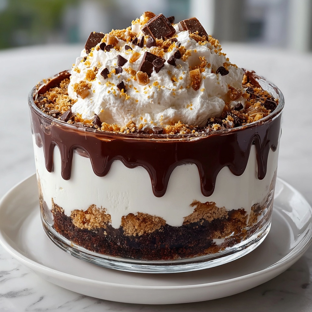 For the grand finale, dollop a final thick layer of whipped cream on top. Then sprinkle the chopped Heath or Skor bars generously over the cream to add a perfect crunchy texture. Add extra drizzles of fudge if you like for those finishing decadent touches that make the trifle a real crowd-pleaser.