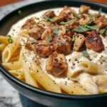 You can freeze this dish, but keep in mind that cream-based sauces sometimes change texture after thawing. To freeze, cool the pasta completely, then transfer it to a freezer-safe container. Freeze for up to 2 months. When ready to eat, thaw overnight in the refrigerator before reheating gently on the stovetop, adding some chicken broth or cream to refresh the sauce.