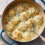 A comforting and creamy chicken stew topped with soft homemade dumplings, perfect for a hearty family dinner. This classic American dish combines tender shredded chicken, vegetables, and a rich, flavorful broth to create a warming, satisfying meal.