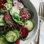 A light and refreshing Crisp Cucumber and Beetroot Salad featuring thinly sliced cucumbers, cooked beets, and red onion, all tossed in a vibrant herb dressing made with fresh dill, parsley, olive oil, and a hint of tangy red wine vinegar or lemon juice. Perfect as a healthy side or light meal, this Mediterranean-inspired salad is vegan, gluten-free, and easy to prepare with no cooking required.