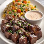 This Easy Hibachi Steak with Fried Rice recipe brings the flavors of Japanese hibachi cooking to your home kitchen. Featuring tender NY strip steak marinated in a savory blend of soy sauce, sesame oil, garlic, and ginger, paired with flavorful fried rice loaded with vegetables and aromatic seasonings, this dish can be prepared in just 30 minutes. Perfect for a quick weeknight dinner that tastes like a restaurant favorite.
