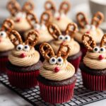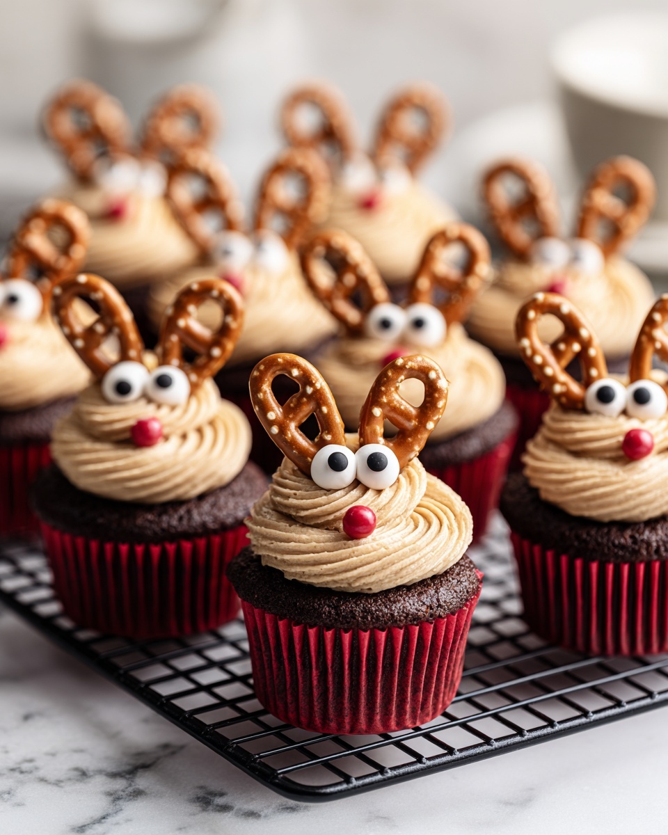 These cupcakes are best served fresh, right after decorating, to keep the pretzels crunchy and the eyes and noses intact. They’re sure to be a hit wherever you bring them, sharing holiday cheer with every delicious bite.