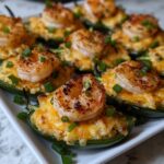 Fiery Cajun Shrimp Stuffed JalapeƱos are a spicy, savory appetizer that combines tender cooked shrimp with creamy cheeses and smoky bacon, all stuffed into fresh jalapeƱo halves and baked to perfection. This dish offers a delightful balance of heat and flavor, enhanced by a touch of Cajun seasoning and topped with fresh chives for a burst of freshness. Perfect as a party finger food or a flavorful snack.