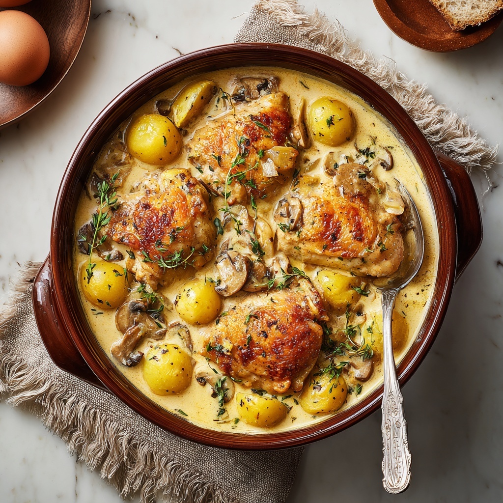 This classic French Chicken Casserole features tender bone-in, skin-on chicken thighs cooked in a rich, creamy mushroom and white wine sauce infused with fresh herbs. Perfectly seared and slow-baked to develop deep flavors, this comforting dish is ideal for a hearty family meal.