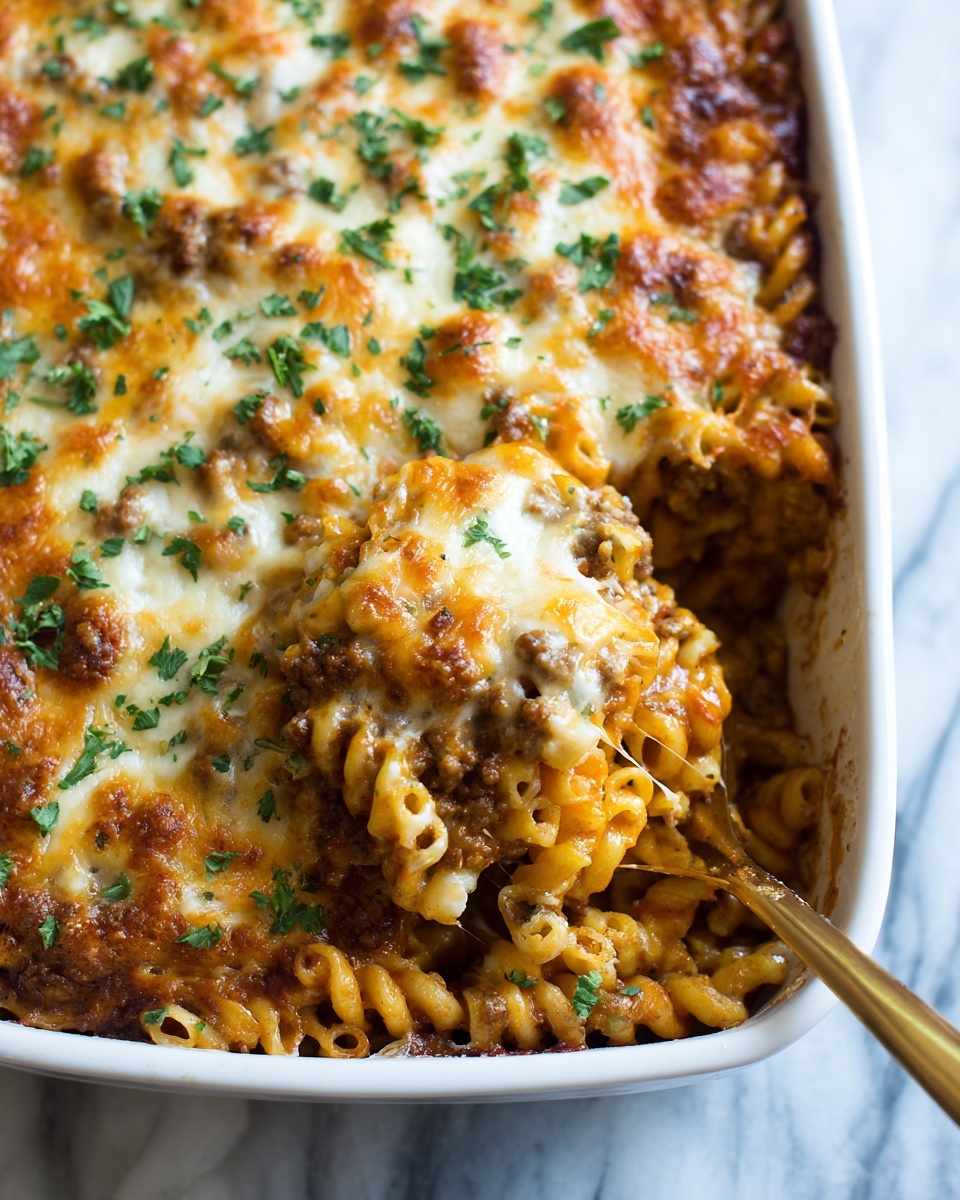 Feel free to swap with any small pasta shape such as shells, rotini, or penne. The key is choosing pasta that holds sauce well and bakes nicely in a casserole.