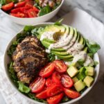 A fresh and vibrant grilled chicken and avocado salad bowl, perfect for a healthy and satisfying meal. Tenderly grilled chicken breasts seasoned with paprika and garlic powder are paired with mixed greens, creamy avocado, cherry tomatoes, cucumber, and a tangy lemon-Dijon dressing. This colorful salad is quick to prepare and ideal for a nutritious lunch or dinner.