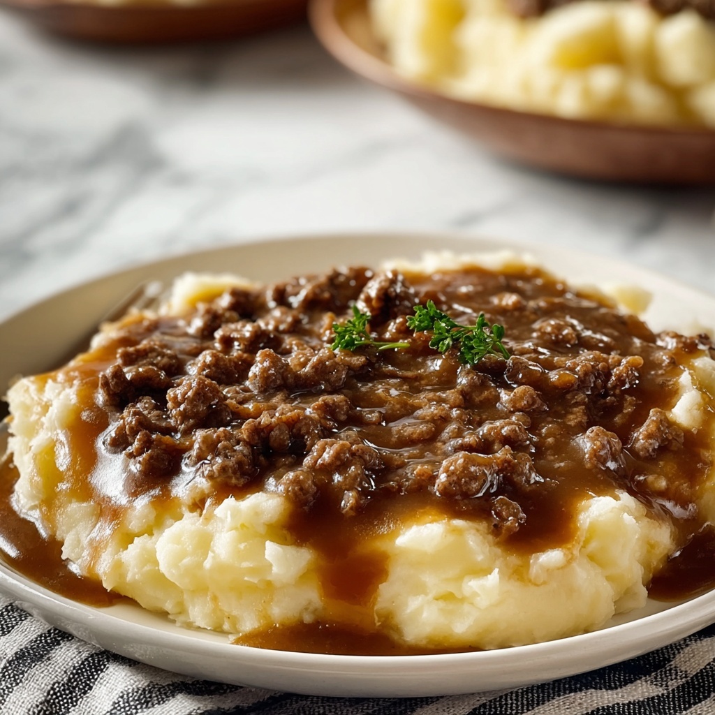 A comforting and hearty meal featuring savory ground beef cooked in a rich brown gravy, served over creamy mashed potatoes. Perfect for a quick and satisfying weeknight dinner.