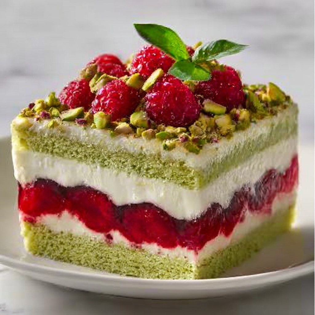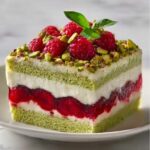 Heavenly Pistachio Raspberry Dream Cake is a luscious layered dessert featuring a moist pistachio-flavored cake base, a tart and sweet raspberry filling, and a light, fluffy whipped cream topping. Garnished with fresh raspberries, chopped pistachios, and optional white chocolate curls, this cake offers a perfect balance of nutty, fruity, and creamy flavors, ideal for celebrations or anytime indulgence.
