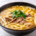 This comforting homemade chicken noodle soup is made from scratch using a rotisserie chicken. The recipe features a rich homemade chicken stock simmered with aromatic vegetables, tender chicken meat, and fresh egg noodles made from scratch. Perfect for chilly days or when you need a soothing bowl of classic soup, this recipe provides warmth and hearty flavors in every spoonful.