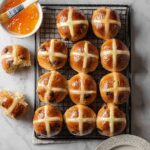 These classic Hot Cross Buns are soft, spiced, and studded with candied peel and sultanas, making them a perfect treat for Easter or any cozy gathering. The buns are gently brushed with milk before baking to keep them soft, and finished with a sweet apricot glaze for a shiny, flavorful crust.