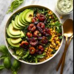 Take your kale and massage it with about one tablespoon of the tahini Caesar dressing until the leaves soften and become more palatable. This little trick reduces kale’s natural toughness and infuses flavor throughout. Arrange sliced avocado and roasted corn evenly over the greens. Nestle the hot honey blackened shrimp on top, then drizzle more dressing as you like. A final sprinkle of shaved Parmesan cheese makes it look stunning and tastes absolutely divine.