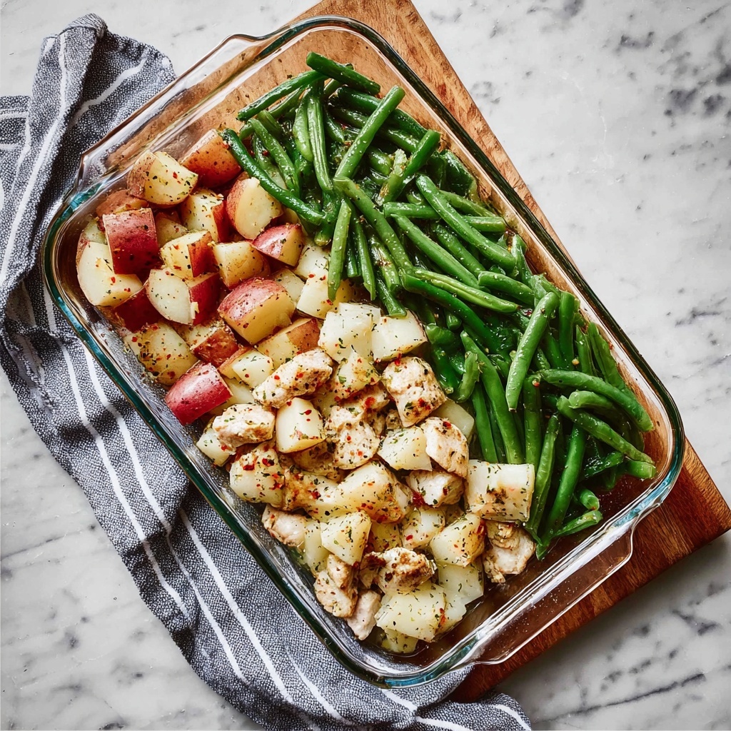 Start by layering your ingredients in a 9×13-inch baking pan. Lay the green beans along one side to create a fresh vegetable border. On the opposite edge, spread out the cubed potatoes so they have room to roast and become tender. Nestle the cubed chicken right between these two, letting some overlap but keeping them mostly distinct—it makes for a perfect balance of flavors in every forkful.