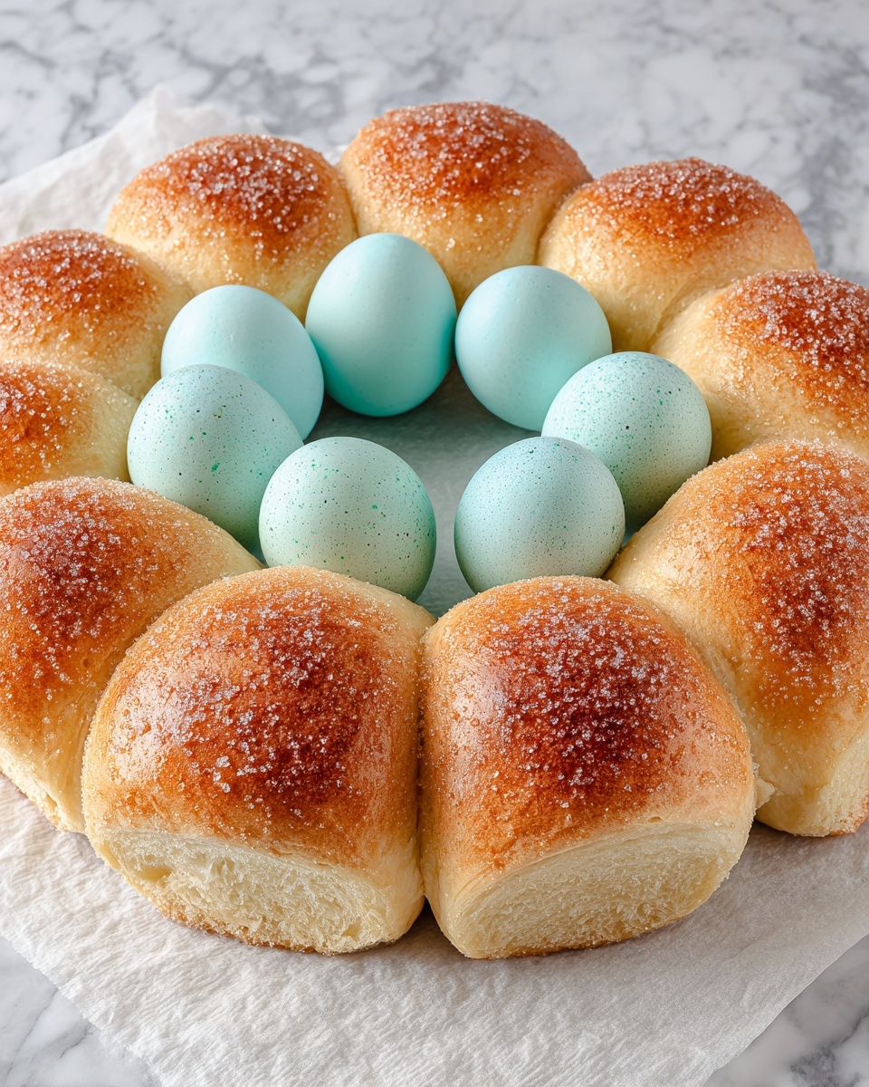 Try placing the bread on a rustic wooden board surrounded by small bowls filled with pastel-colored jelly beans or chocolate eggs to echo the festive theme. Another charming idea is to nestle tiny sprigs of rosemary between the dyed eggs for a fragrant surprise.