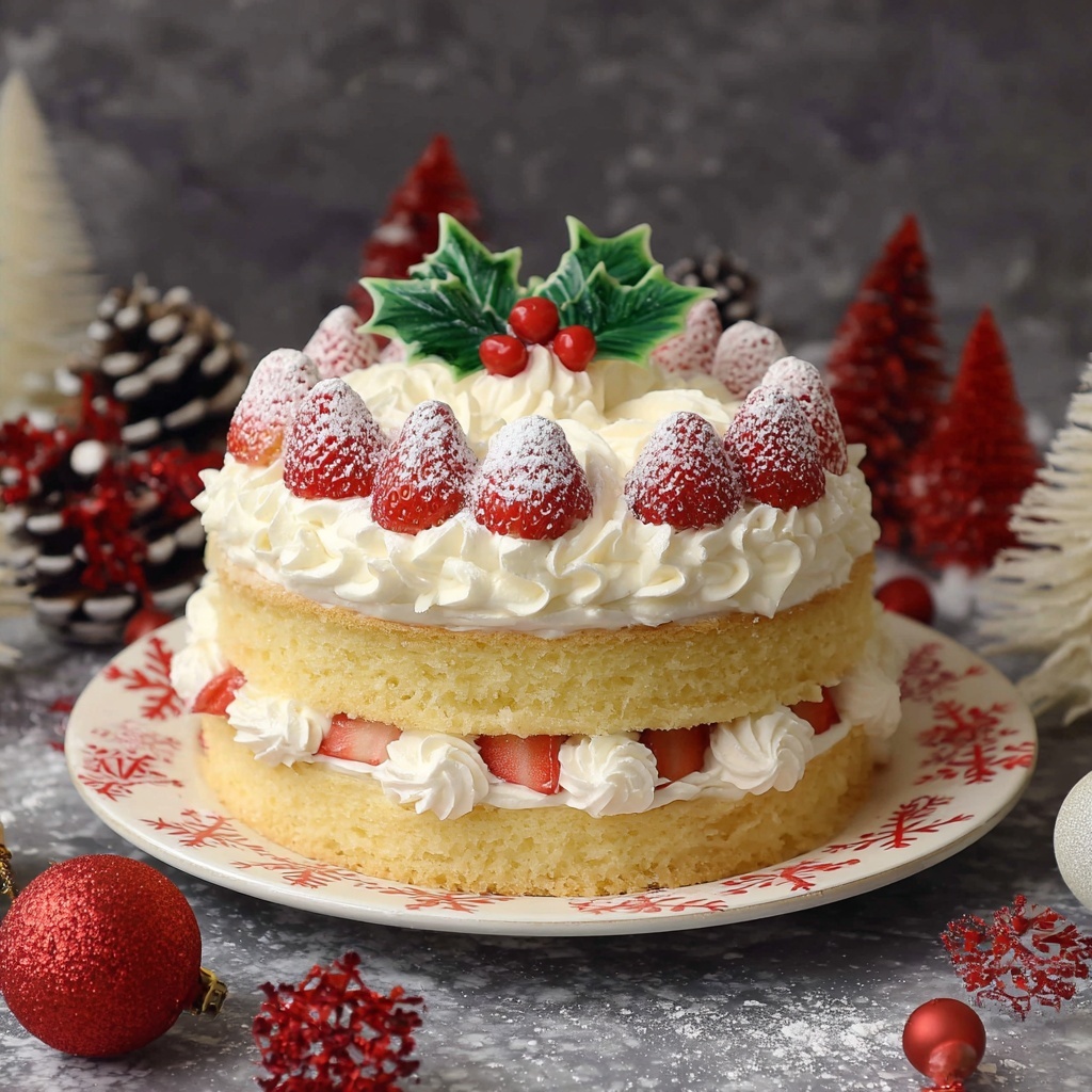 This Japanese Christmas Cake, also known as Strawberry Shortcake, is a light and fluffy sponge cake layered with fresh strawberries and whipped cream. Perfectly sweet and creamy, this festive dessert combines the delicate texture of a Japanese sponge with the freshness of seasonal strawberries, making it an ideal celebration treat for Christmas or any special occasion.
