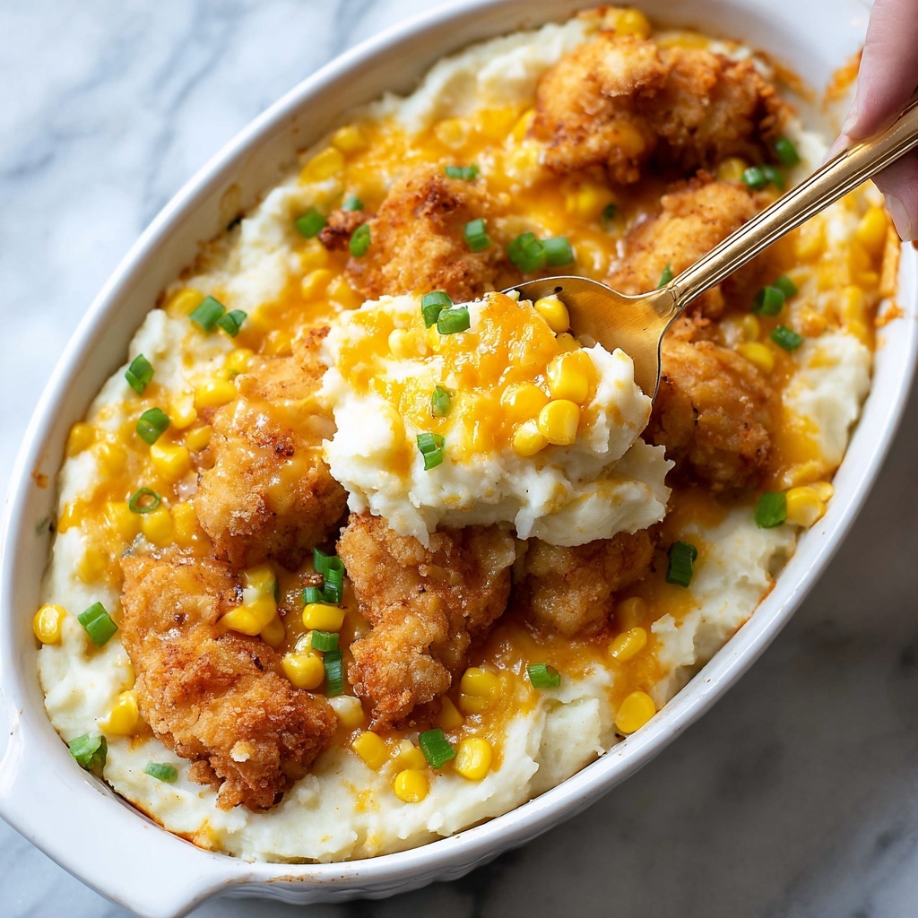 - Assemble the Casserole: In a 9×13 inch casserole dish, layer the ingredients starting with the mashed potatoes at the bottom, then spread the frozen corn evenly over the potatoes. Arrange the cooked chicken tenders on top of the corn, sprinkle shredded cheese over the chicken, and finally pour the gravy evenly across the entire casserole.