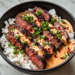 Korean BBQ Steak Rice Bowls with Spicy Cream Sauce combine tender marinated steak with fresh vegetables and a creamy, spicy sauce for a quick, flavorful meal. This dish features thinly sliced flank or sirloin steak marinated in a savory Korean BBQ sauce, grilled to perfection, and served over rice with shredded carrots, cucumber, kimchi, and green onions. The spicy cream sauce adds a zesty finish, making it a delightful bowl perfect for a satisfying weeknight dinner.