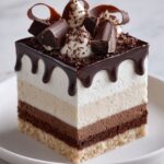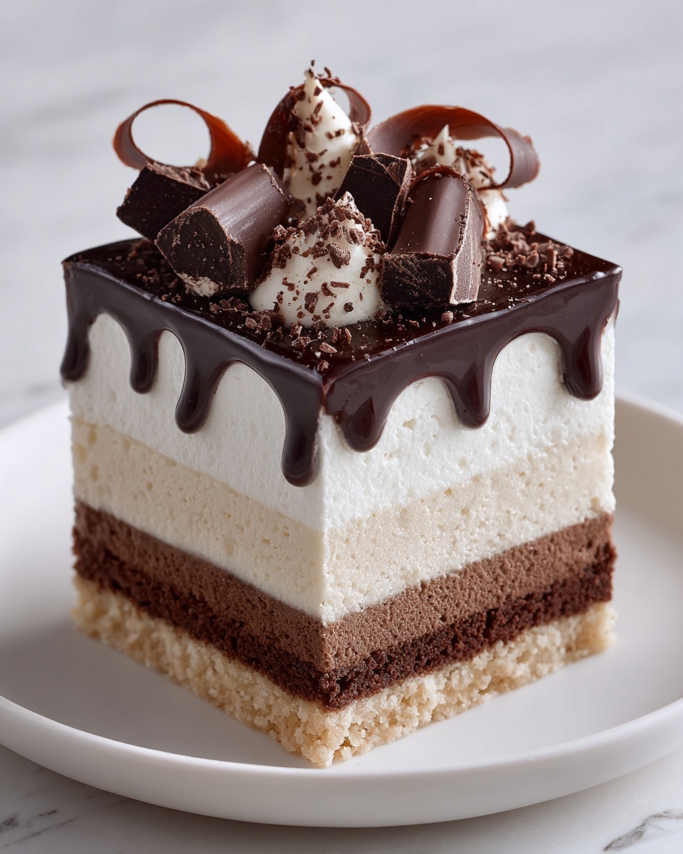 5. Top and serve: Just before serving, top the dessert with a generous layer of whipped cream and sprinkle chocolate shavings over the top for an elegant finish. Slice into portions and serve chilled to enjoy the creamy, layered chocolate delight.