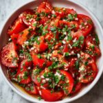 A fresh and vibrant Lebanese Tomato Salad combining juicy tomatoes, crisp cucumber, and tangy red onion, dressed with olive oil, lemon juice, and a hint of dried mint. This easy and quick salad is perfect as a light side dish or refreshing appetizer.