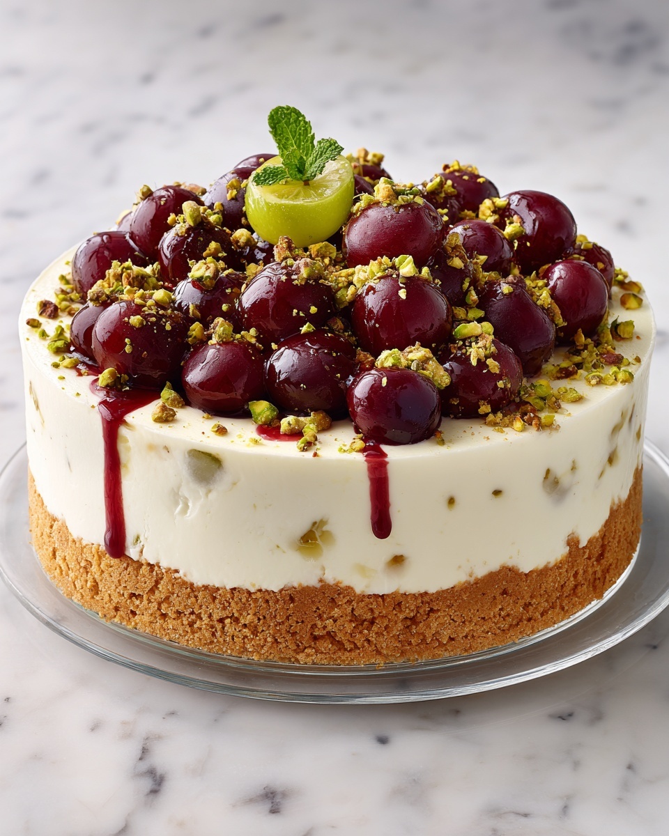 Simple garnishes elevate this cheesecake from delicious to unforgettable. A light sprinkle of lemon and lime zest over the top enhances its bright citrus notes and adds a beautiful visual contrast. The scattered chopped pistachios not only add a satisfying crunch but also bring a vibrant green hue that complements the cherries. Fresh cherries or a few sprigs of mint make for an elegant finishing touch at dessert time.