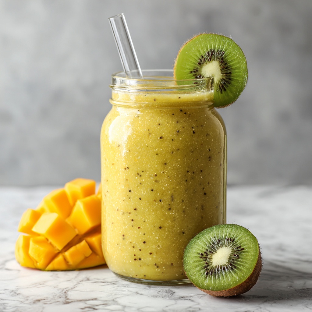 Pour your vibrant Mango Kiwi Smoothie Recipe into a tall glass and get ready to enjoy every velvety sip.