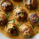 This comforting recipe features tender meatballs simmered in a creamy Dijon mustard gravy, perfect for a hearty dinner. Made with a blend of ground beef, breadcrumbs, and aromatic seasonings, these meatballs are pan-seared to develop a flavorful crust and then cooked gently in a rich, savory sauce. Served best over mashed potatoes, egg noodles, or rice, this dish offers a delicious balance of protein and creamy comfort.