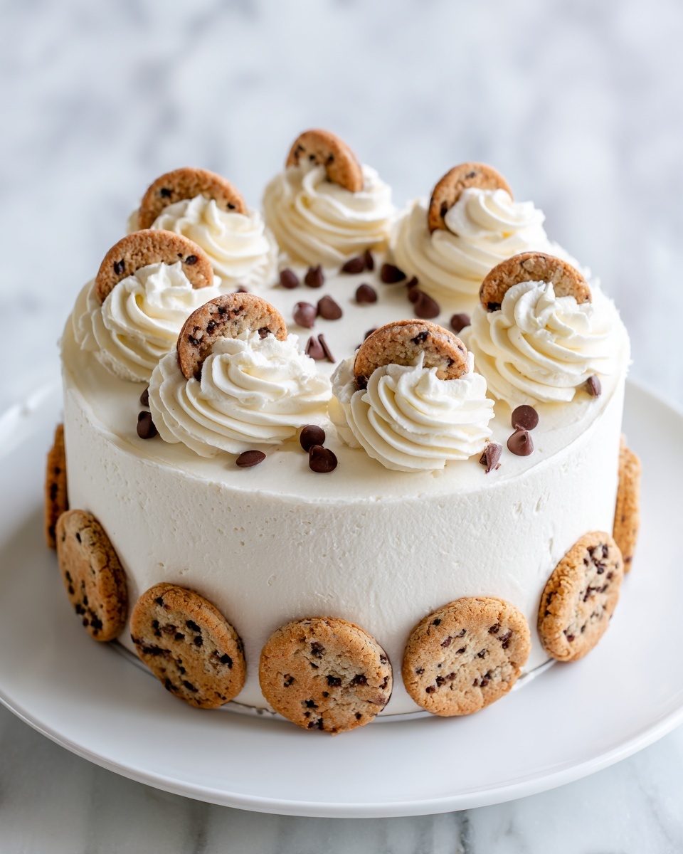 The finishing touches make all the difference when serving Milk and Cookies Cake – A Sweet Indulgence Recipe. Mini chocolate chip cookies and cookie crumbs enhance the cookie theme, while a gentle drizzle of chocolate adds luxurious shine and extra gooey flavor. These garnishes invite everyone to dig in with delight.