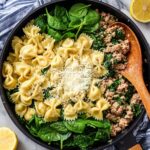This One-Pan Tortellini and Sausage Skillet Dinner is a quick and flavorful meal perfect for busy weeknights. Tender cheese tortellini cooks in a savory sausage and broth mixture, enhanced by fresh spinach, garlic, onion, and a bright hint of lemon. Finished with grated Pecorino Romano cheese, this hearty yet easy skillet dish brings comfort and zest to your table in just 20 minutes.