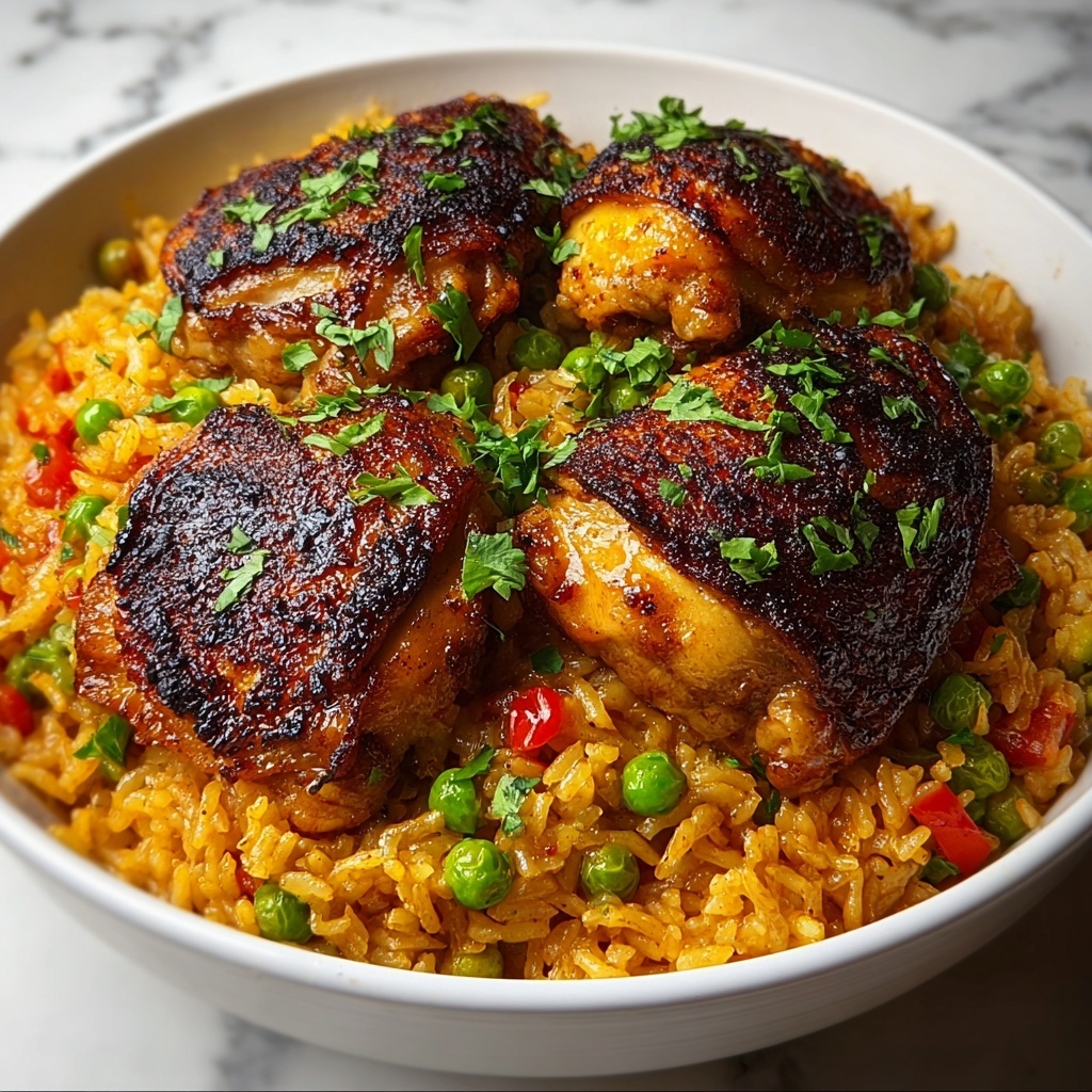 A comforting and easy one-pot chicken and rice recipe that combines tender chicken thighs with flavorful rice cooked in savory chicken broth, onions, garlic, and sweet peas. Perfect for a family meal ready in just 45 minutes.