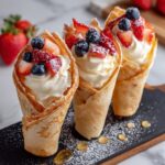Now here is where you get to be creative and generous! Spoon fresh fruit into the fold first to add color and juicy sweetness. Then dollop your whipped cream or Greek yogurt over the fruit for that creamy texture. If you’re feeling a little extra, sprinkle chocolate chips inside for a lovely surprise with every bite.