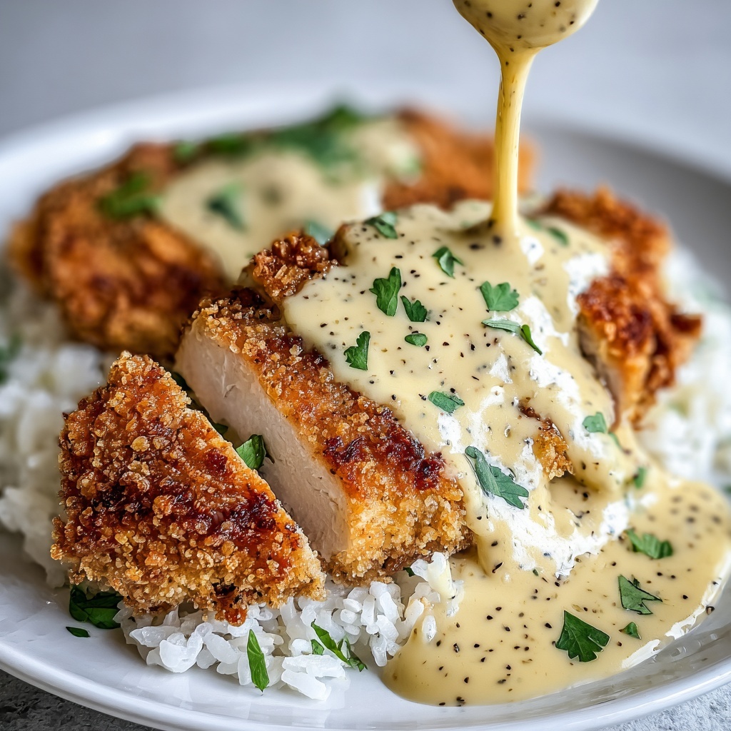 This Parmesan-Crusted Chicken with Creamy Garlic Sauce is a delightful dish featuring tender chicken cutlets coated in a crispy Parmesan and breadcrumb crust. Pan-seared to golden perfection and finished in the oven, the chicken is then topped with a luscious, creamy garlic sauce that brings rich flavors and a comforting texture. Ideal for a quick yet elegant 30-minute meal that serves 4.