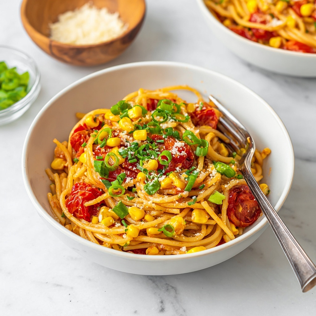 Next, stir in the corn kernels and sliced roasted red peppers along with any optional red pepper flakes if you enjoy a little heat. Cook everything together for 2 to 3 minutes until warmed through and mingling beautifully. The sweetness of the corn and smoky notes of the peppers elevate the entire dish, creating layers of flavor that complement the tender pasta.