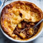 A rich and hearty slow-cooked steak pie featuring tender stewing beef simmered with vegetables and herbs, topped with flaky puff pastry for a comforting British-inspired main course perfect for cozy dinners.