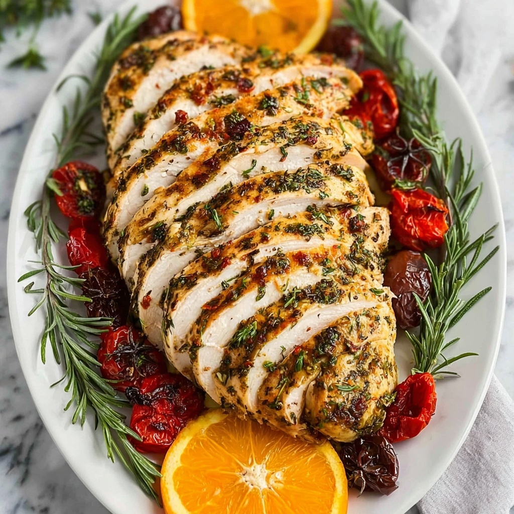 A flavorful roasted turkey breast infused with a garlic herb butter blend, delivering juicy, tender meat with a crispy, aromatic skin perfect for a comforting family meal or festive occasion.