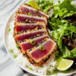 7. Serve: Plate the sliced tuna and garnish with sliced green onions and lime wedges if desired. Serve warm or at room temperature alongside your choice of rice, noodles, or fresh salad.